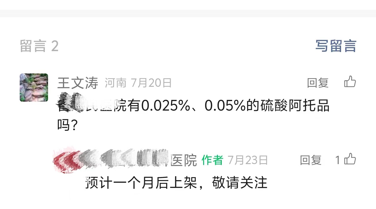 南财快讯记者致电河南该眼科医院,相关工作人员表示,0.025%和0.05%浓度的硫酸阿托品眼药有可能在下个月上架,两款药品均为院内制剂(院内制剂是指医疗机构根据本单位临床需要经批准而配制、只能在本医疗机构内使用的固定处方制剂)。该医院官方公众号日前也发文称将在下个月上架0.025%和0.05%浓度的硫酸阿托品眼药。