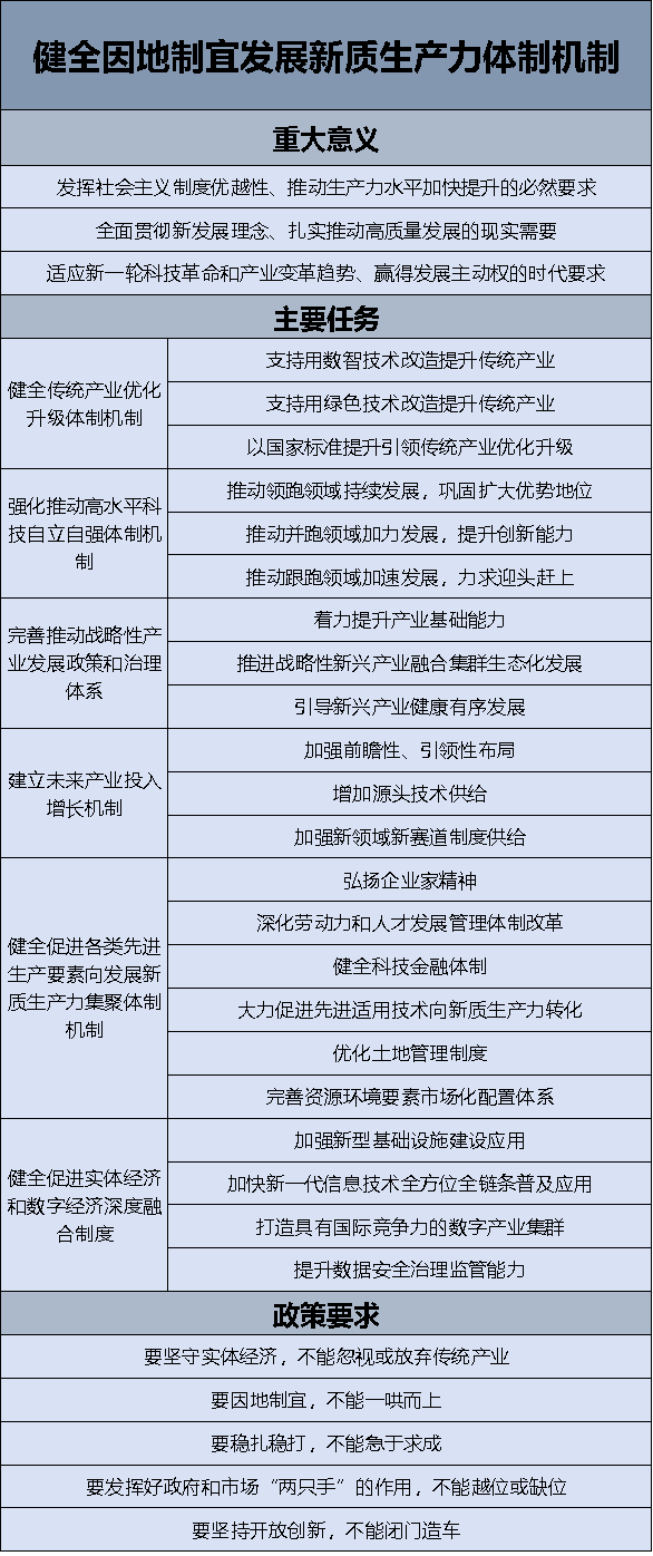 其中,文章提出了六大主要任务,包括:健全传统产业优化升级体制机制,强化推动高水平科技自立自强体制机制,完善推动战略性产业发展政策和治理体系,建立未来产业投入增长机制,健全促进各类先进生产要素向发展新质生产力集聚体制机制,健全促进实体经济和数字经济深度融合制度。