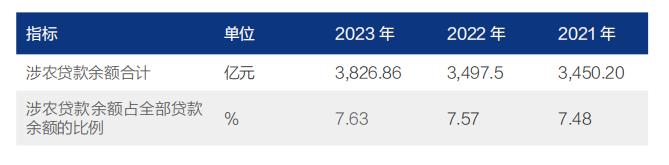浦发银行2023年ESG报告显示,该行涉农贷款余额3826.86亿元,占全部贷款余额的7.63%,较2022年增加329.36亿元,近三年涉农贷款余额及占比呈上升趋势。