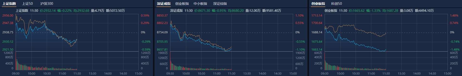 市场早盘震荡调整,创业板指领跌。南财金融终端显示,截至午间收盘,沪指跌0.22%,深成指跌0.95%,创业板指跌1.33%。总体上个股跌多涨少,全市场超3200只个股下跌。