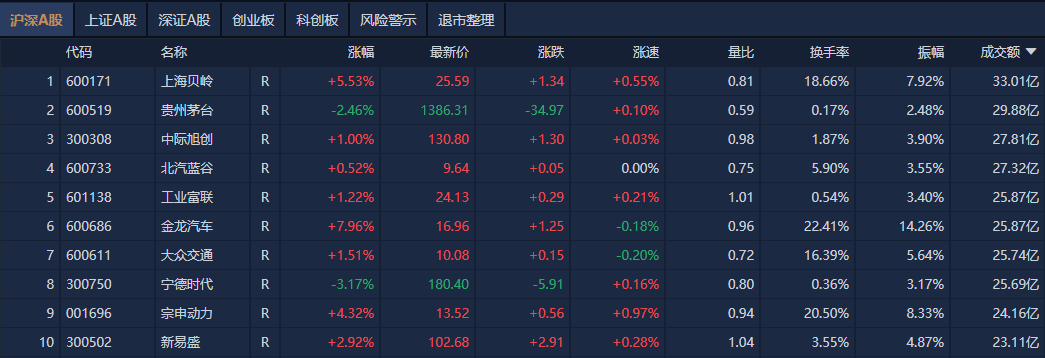 沪深两市成交额半日5173亿元,较上个交易日同期缩量294亿元。个股方面,南财金融终端显示,上海贝岭成交额33.01亿元居首,贵州茅台、中际旭创、北汽蓝谷成交额靠前。