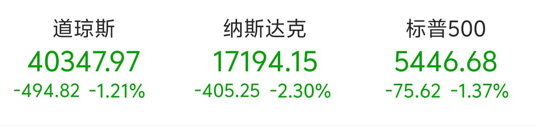 当地时间周四,美股三大指数均大幅收跌。截至收盘,道指跌1.21%报40347.97点,标普500指数跌1.37%报5446.68点,纳指跌2.3%报17194.15点。
