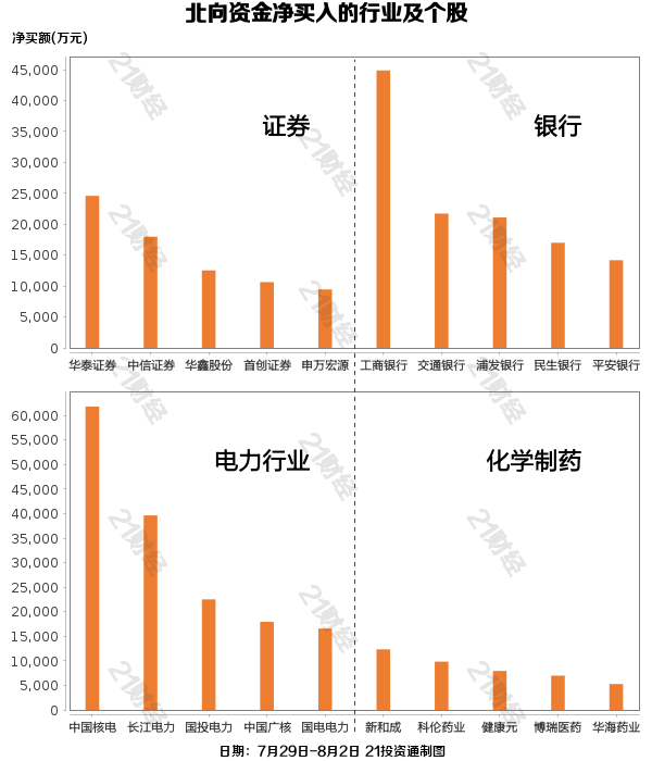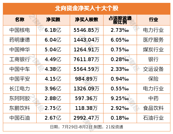 个股方面,北向资金净买入中国核电(601985.SH)、药明康德(603259.SH)、中国神华(601088.SH)、工商银行(601398.SH)、中国中车(601766.SH)居前,其中,中国核电被净买入6.18亿元,药明康德被净买入6.04亿元,中国神华被净买入5.04亿元,工商银行被净买入4.49亿元,中国中车被净买入4.38亿元。