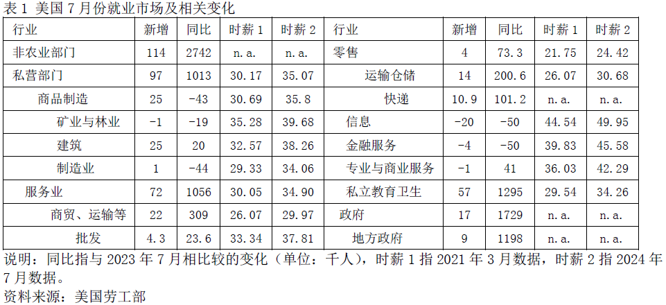 表1 美国7月份就业市场及相关变化