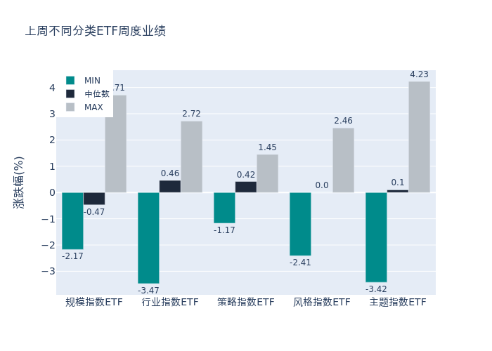 上周股票型ETF周度收益率中位数为0.06%。其中按照不同分类,规模指数中富国中证2000ETF周度收益率最高,为3.71%;行业指数中南方中证全指计算机ETF周度收益率最高,为2.72%;策略指数中前海开源中证500等权ETF周度收益率最高,为1.45%;风格指数中嘉实医药健康100ETF周度收益率最高,为2.46%;主题指数中南方中证创新药产业ETF周度收益率最高,为4.23%。