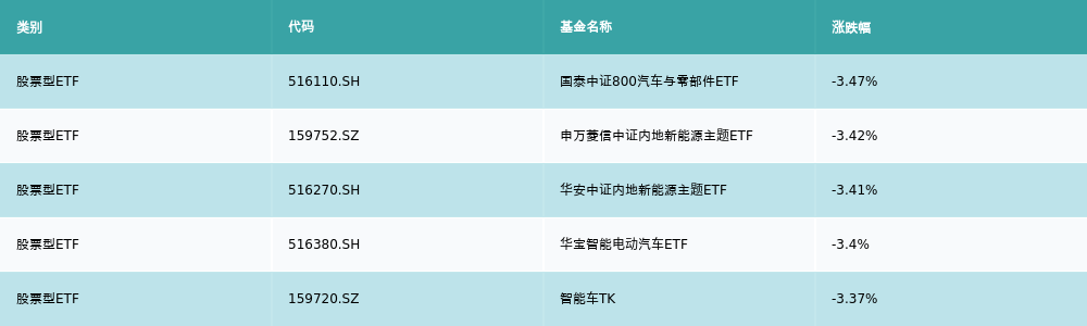 上周股票型ETF跌幅最大的5支ETF及其收益率分别为:国泰中证800汽车与零部件ETF(-3.47%)、申万菱信中证内地新能源主题ETF(-3.42%)、华安中证内地新能源主题ETF(-3.41%)、华宝智能电动汽车ETF(-3.4%)、智能车TK(-3.37%)。详情见下表: