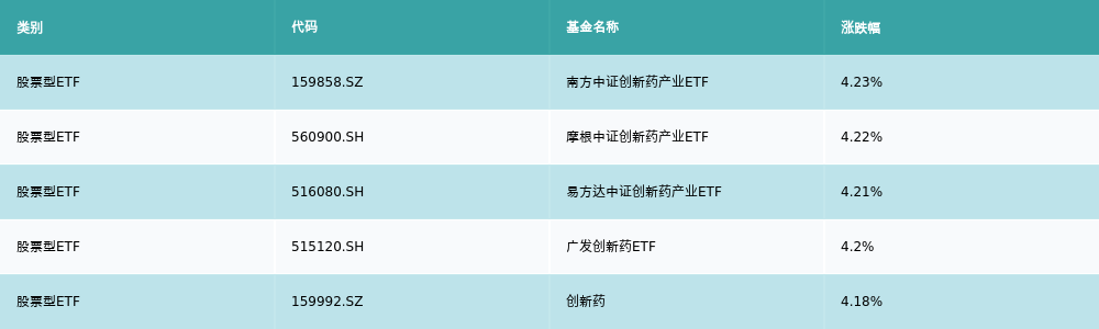 上周股票型ETF涨幅最高的5支ETF及其收益率分别为:南方中证创新药产业ETF(4.23%)、摩根中证创新药产业ETF(4.22%)、易方达中证创新药产业ETF(4.21%)、广发创新药ETF(4.2%)、创新药(4.18%)。详情见下表: