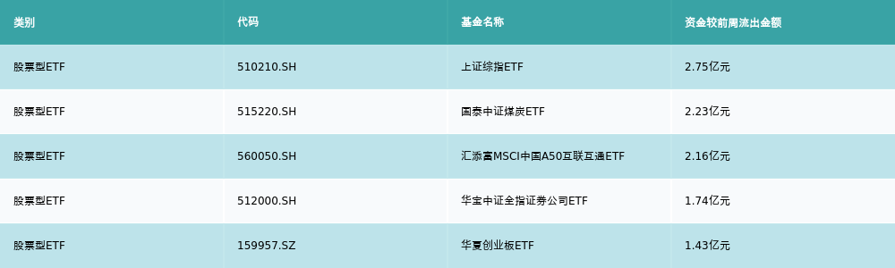 上周股票型ETF资金流出最多的5支ETF及其流入金额分别为:上证综指ETF(流出2.75亿元)、国泰中证煤炭ETF(流出2.23亿元)、汇添富MSCI中国A50互联互通ETF(流出2.16亿元)、华宝中证全指证券公司ETF(流出1.74亿元)、华夏创业板ETF(流出1.43亿元)。详情见下表: