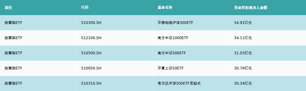 上周股票型ETF资金流入最多的5支ETF及其流入金额分别为:华泰柏瑞沪深300ETF(流入54.91亿元)、南方中证1000ETF(流入34.11亿元)、南方中证500ETF(流入31.03亿元)、华夏上证50ETF(流入30.76亿元)、易方达沪深300ETF发起式(流入30.34亿元)。详情见下表: