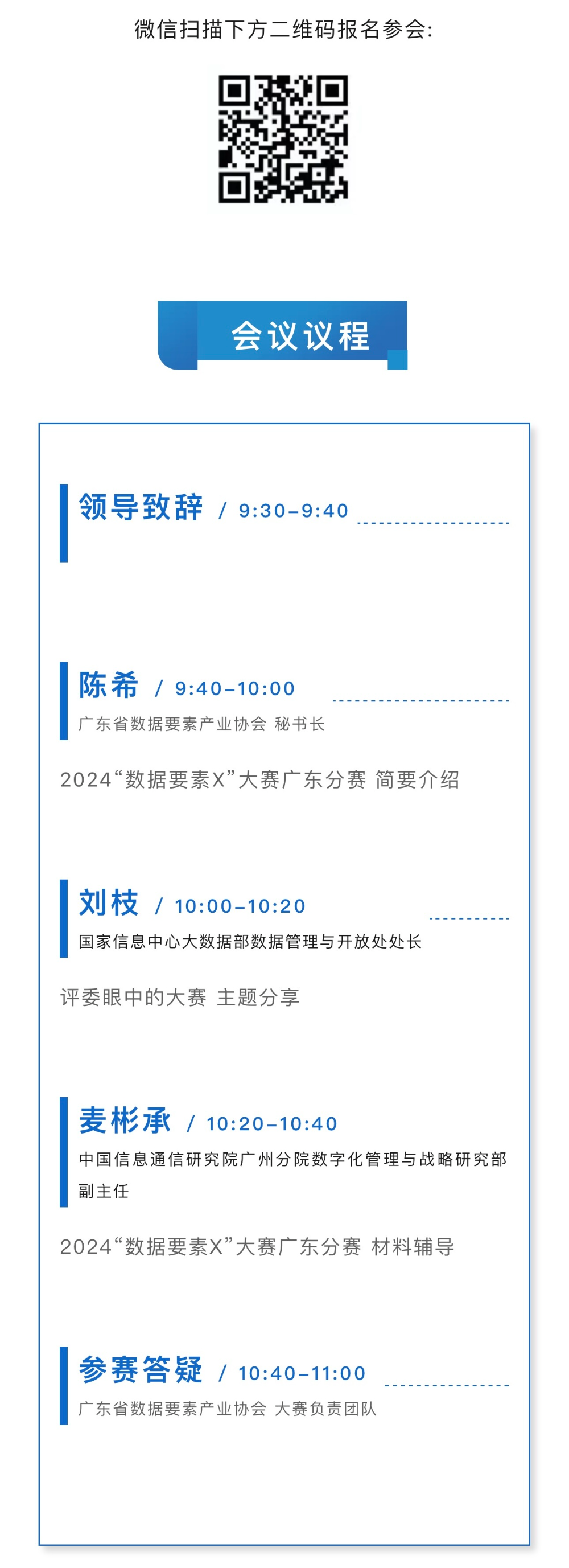 广东分赛按照12个赛道设置赛事,各赛道赛事分为初赛、决赛两个阶段,优胜项目将参与今年10月举行的全国总决赛。为顺利推进广东分赛的举办,广东省数据要素产业协会作为大赛的执行单位,将于2024年8月6日(星期二)上午9:30-11:00在深圳市福田区市民中心对12个赛道开展专题辅导会。本次会议邀请了协会大赛负责团队和大赛指导专家,将对大赛情况进展、评审注意事项和参赛答疑三方面进行详细分享。