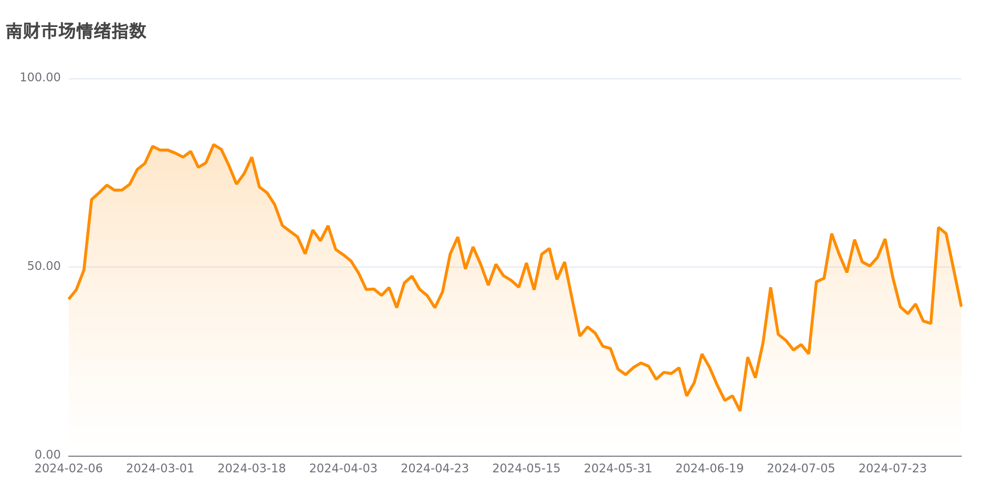 今日南财市场情绪指数为39.5,较前一交易日49.3大幅下跌,市场投资热度明显降低。