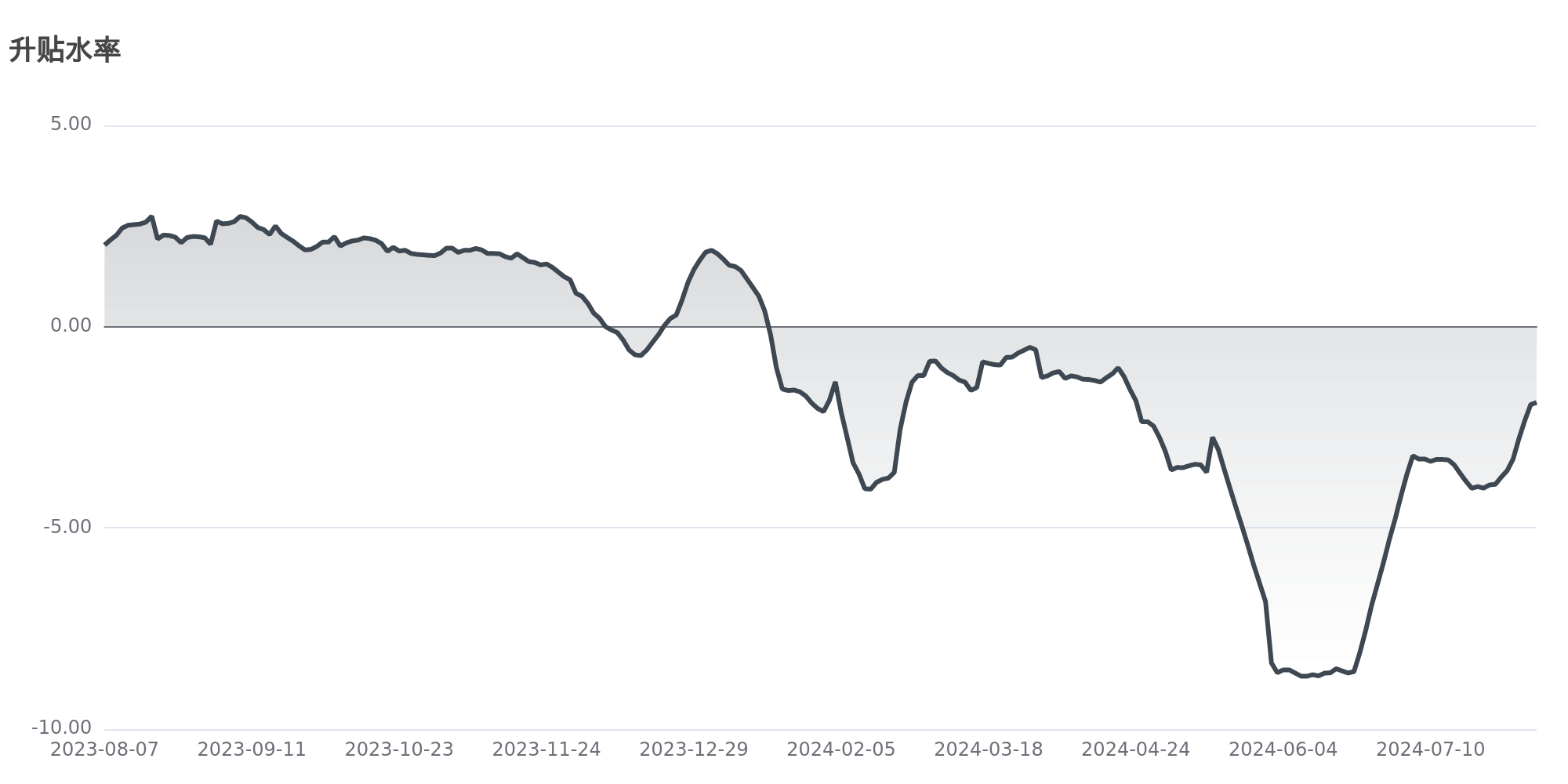 今日该指标值为-1.88%,目前该指标处于近一年中立区间,说明投资者对A股持中立情绪。反映期货市场投资者对市场的看法,该指标越高说明投资者认为当前市场较强,越低则说明认为市场相对较弱,因而与上证指数正相关。