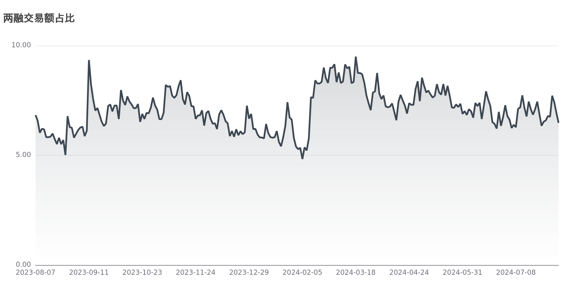 今日该指标值为6.48%,目前该指标处于近一年较低区间,说明投资者认为A股市场趋于触底反弹。反映场内投资者借钱炒股的杠杆水平,该指标越高说明杠杆水平越高,即投资者认为当前市场较强,反之则说明投资者认为市场相对较弱,因而与上证指数存在较强的正相关性。