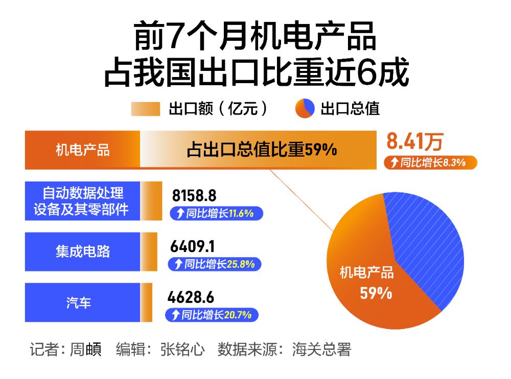 海关数据显示,今年前7个月,我国出口机电产品8.41万亿元,同比增长8.3%,占我国出口总值的59%。其中,自动数据处理设备及其零部件 8158.8亿元,增长11.6%;集成电路6409.1亿元,增长25.8%;汽车4628.6亿元,增长20.7%;手机4547.4亿元,下降1.3%。