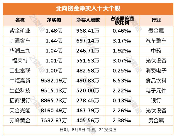 个股方面,北向资金净买入紫金矿业(601899.SH)、宇通客车(600066.SH)、华润三九(000999.SZ)、福莱特(601865.SH)、工业富联(601138.SH)居前,其中,紫金矿业被净买入1.48亿元,宇通客车被净买入1.44亿元,华润三九被净买入1.04亿元,福莱特被净买入1.01亿元,工业富联被净买入1.00亿元。