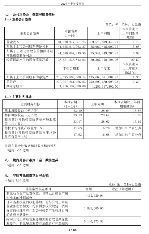 8月8日晚,贵州茅台发布2024年半年度报告,报告提到公司上半年实现营业收入819.31亿元,同比增长17.76%;归属于上市公司股东的净利润416.96亿元,同比增长15.88%。