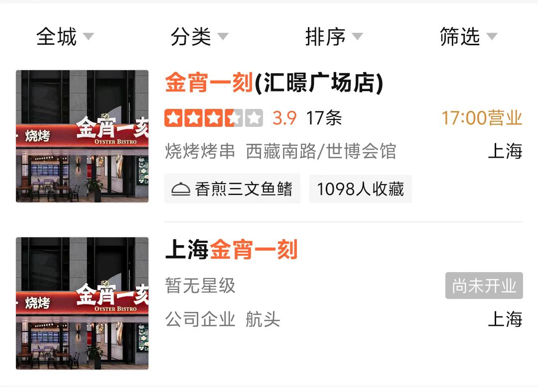 大众点评显示,“金宵一刻”目前有两家门店,已开业的一家位于上海市黄浦区鲁班路617号,另一家目前还在筹备中,尚未开业。