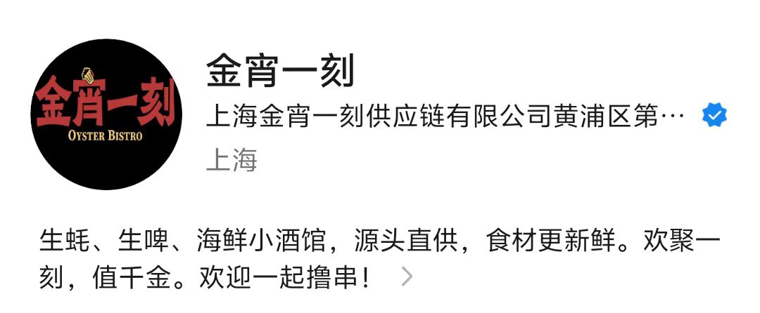“金宵一刻”微信公众号的简介显示,其为“生蚝、生啤、海鲜小酒馆”,主打“源头直供,食材更新鲜”。背后的认证主体为上海金宵一刻供应链有限公司黄浦区第一分公司,注册时间为2024年7月27日。经营范围包括餐饮服务、食品销售、餐饮管理等。