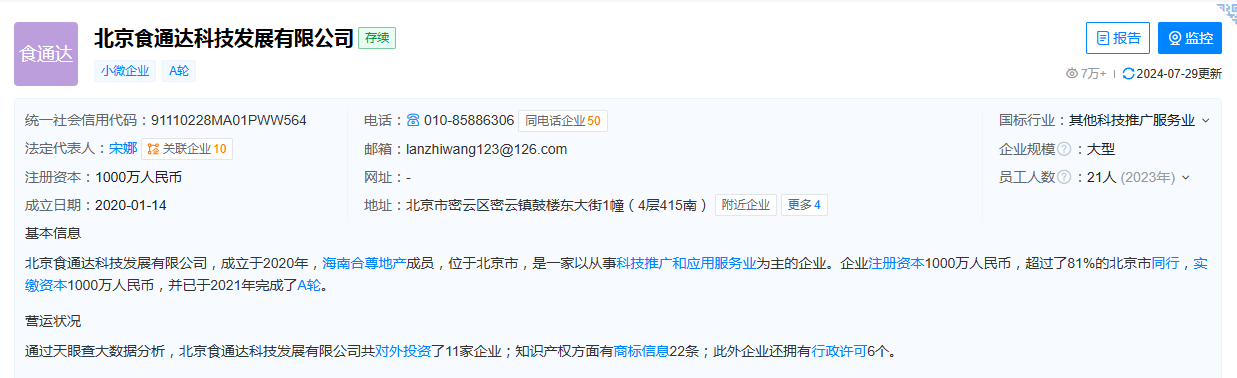 天眼查信息显示,麻六记酸辣粉委托方为北京食通达科技发展有限公司,该公司成立于2020年1月,注册资本1000万元,法定代表人为宋娜,董事长为汪小菲,经营范围含第二类医疗器械销售、保健食品(预包装)销售、家用电器销售、餐饮管理、供应链管理服务、食品销售(仅销售预包装食品)等。