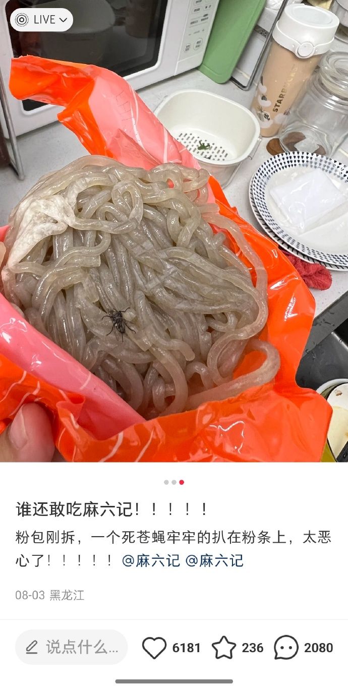 近日,有网友发文称在麻六记酸辣粉中吃到苍蝇,引发网友广泛关注。