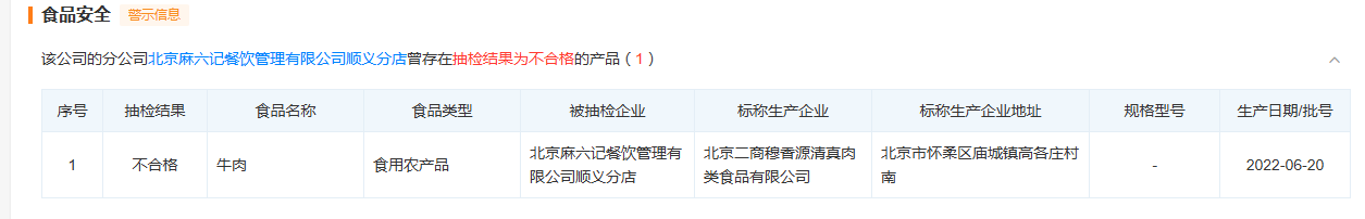此外,北京麻六记餐饮管理有限公司顺义分店也被查出存在食品安全问题,其在食品安全抽检中被检测出牛肉苯甲酸及其钠盐指标不合格,该产品标注的生产企业为北京二商穆香源清真肉类食品有限公司。