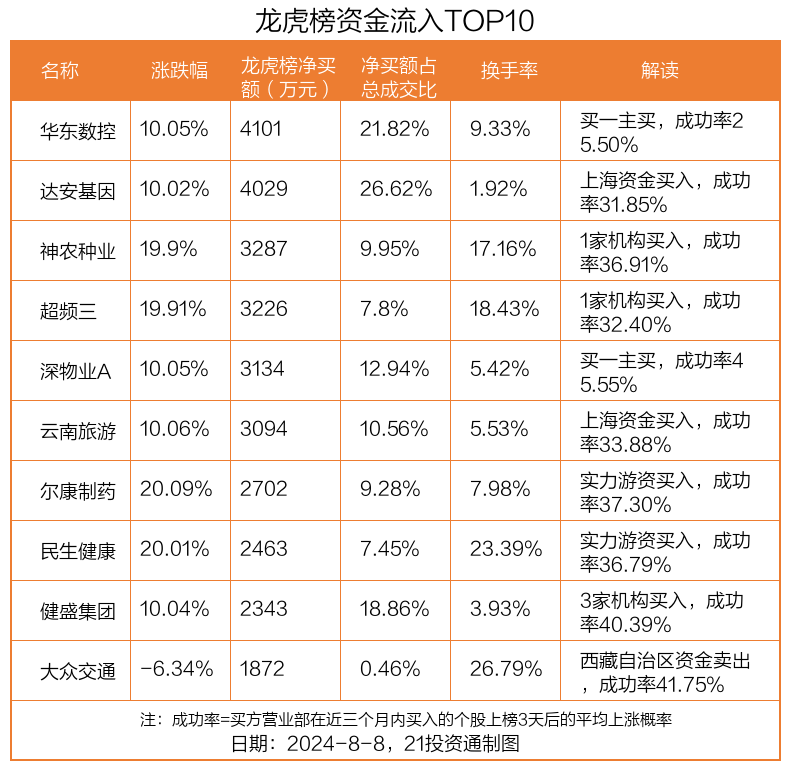 8月8日,上证指数下跌0%,深证成指下跌0.04%,创业板指下跌0.54%。盘后龙虎榜数据显示,共有44只个股因当日异动登上龙虎榜,资金净流入最多的是华东数控(002248.SZ),达0.41亿元。