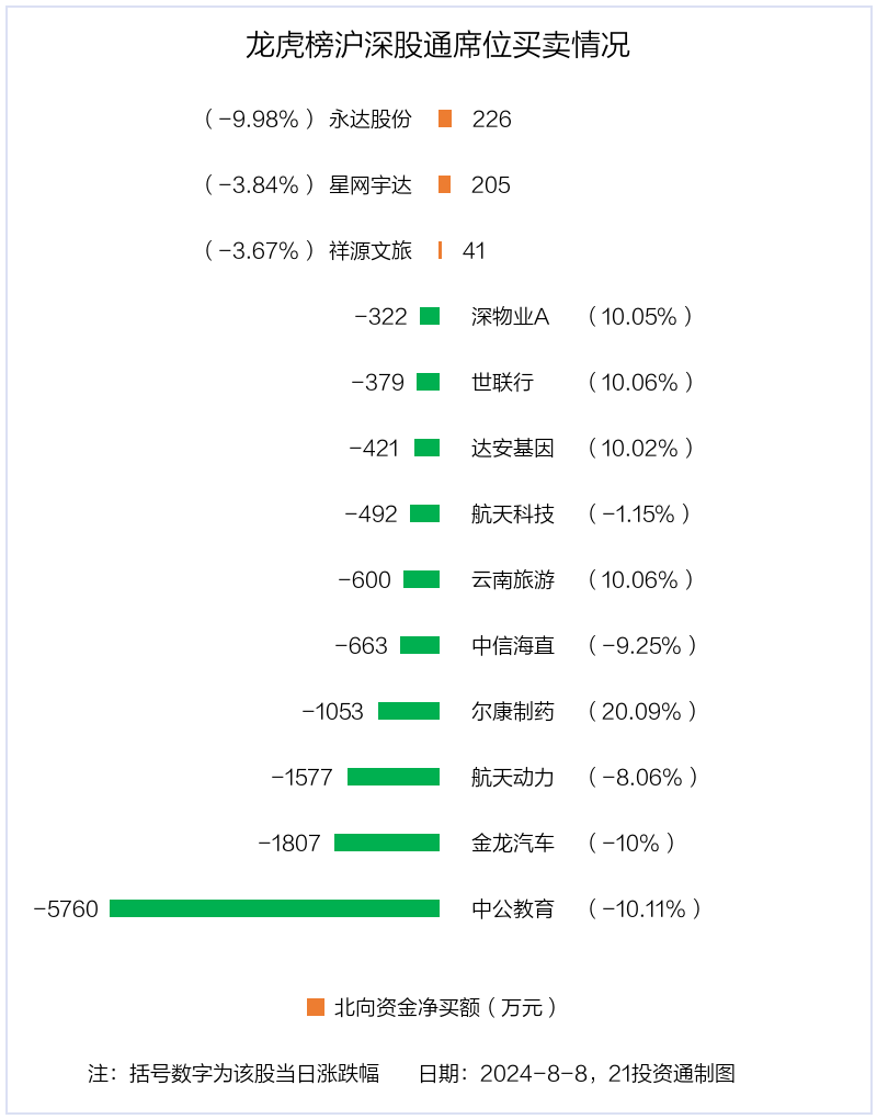 8月8日,北向资金参与龙虎榜中的个股共有13只,合计净卖出1.26亿元。其中沪股通净买入1 股,净卖出2 股,合计净卖出3342.56万元;深股通净买入2 股,净卖出8 股,合计净卖出9259.11万元。