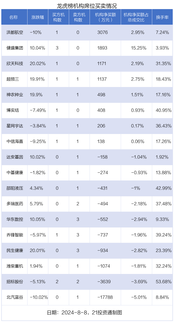 其中,机构净买入金额最多的是洪都航空(600316.SH),当日收盘下跌10%,换手率为7.24%。