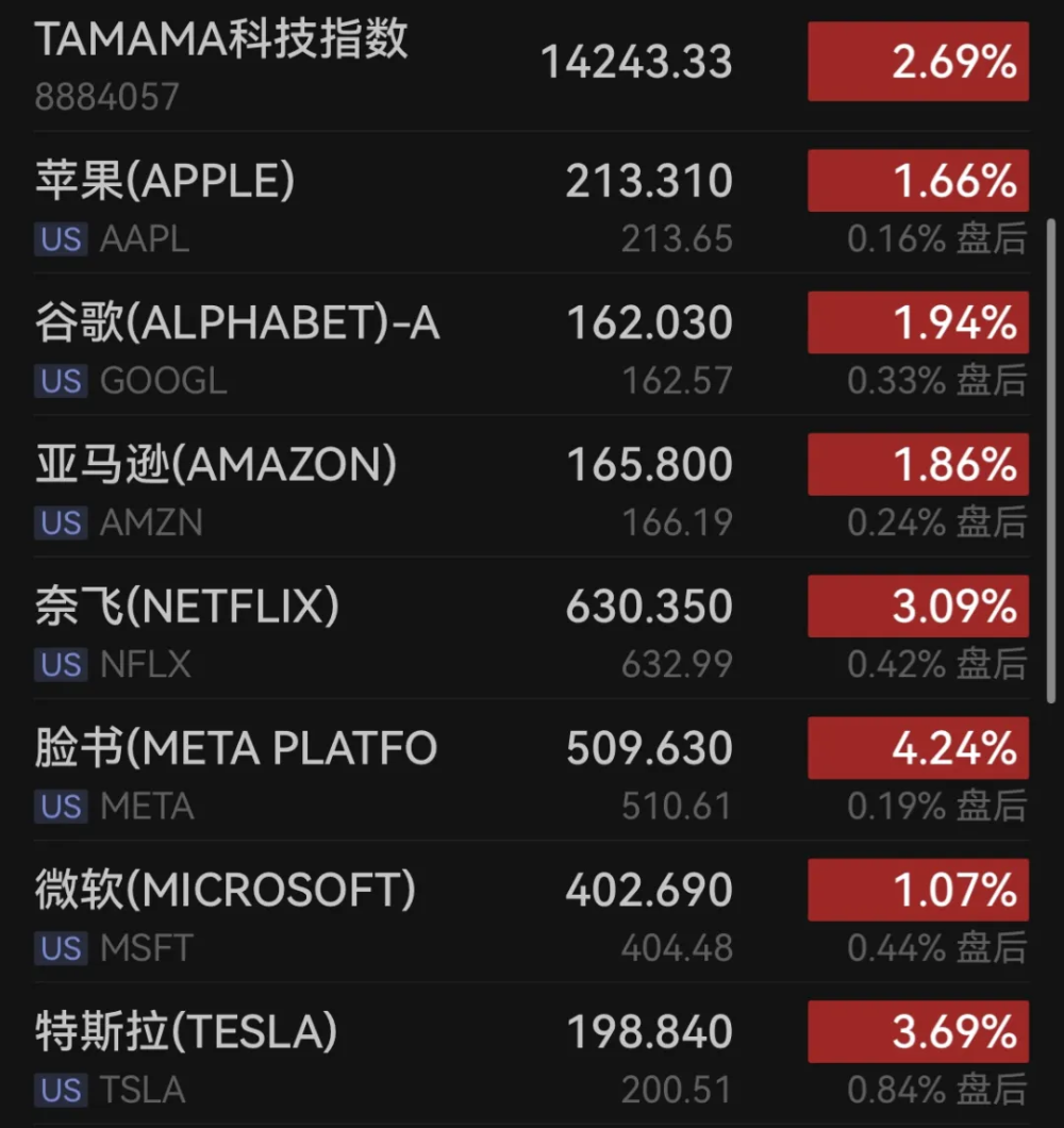科技股全线走高,万得美国TAMAMA科技指数涨2.69%,特斯拉涨3.69%,苹果涨1.66%,亚马逊涨1.86%,奈飞涨3.09%,谷歌涨1.94%,脸书涨4.24%,微软涨1.07%。