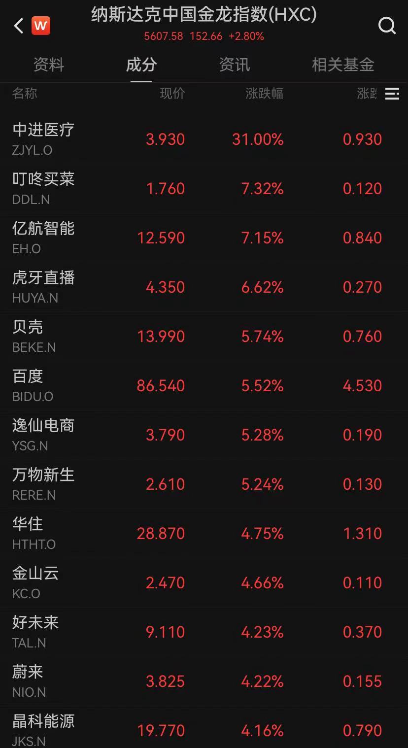热门中概股普涨,纳斯达克中国金龙指数收涨2.8%。百度涨超5%,蔚来涨超4%,微博、小鹏汽车、唯品会、阿里巴巴涨超3%,理想汽车、京东、富途控股、网易、腾讯音乐涨超2%,知乎涨超1%,爱奇艺小幅上涨。