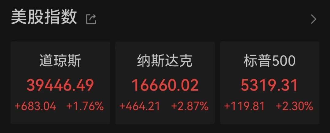 美股三大指数集体上涨,截至收盘,道指涨1.76%,报39446.49点,标普500指数狂飙近700点涨2.3%,报5319.31点,纳指涨2.87%,报16660.02点。道指与标普500指数均创一年来的最大单日涨幅。