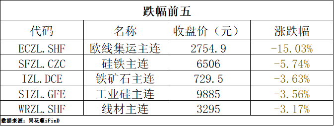 8月8日,国内商品期货收盘,跌多涨少。欧线集运跌超15%,硅铁跌超5%,铁矿石、工业硅、线材跌超3%;燃油涨超2%,低硫燃油、玉米、生猪、原油涨超1%。