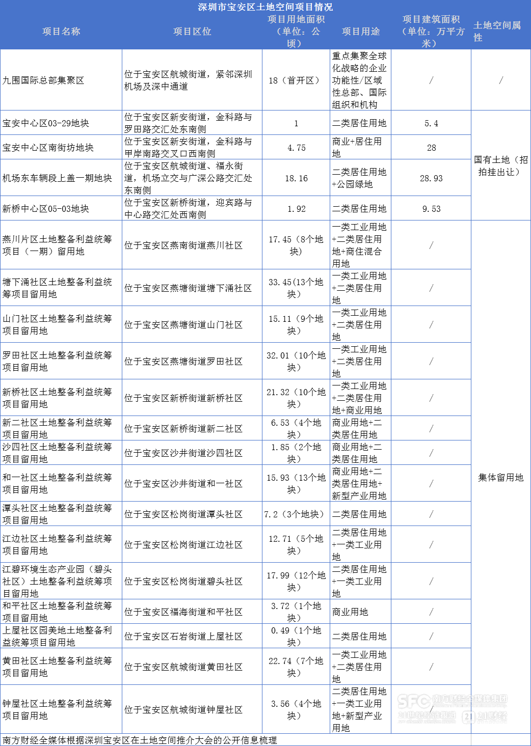 与龙岗区类似,宝安区本次推介会也推出多元的土地空间,既包括可进行招拍挂的国有土地,也有集体留用地,共计102个地块。
