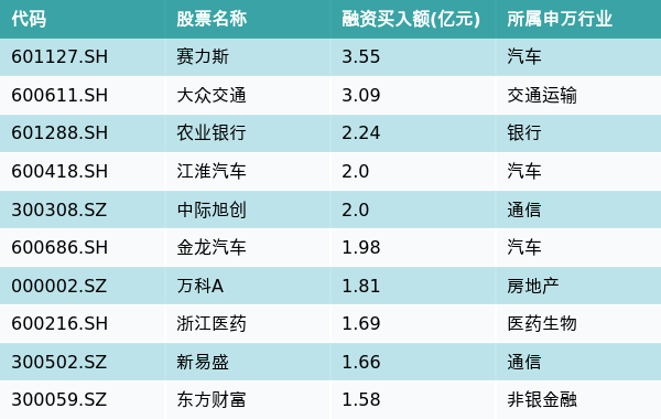 8月12日,两市共有3354只个股有融资资金买入,其中赛力斯、大众交通、农业银行排名前三,买入金额分别3.55亿元、3.09亿元、2.24亿元。融资买入额前10个股详情见下表: