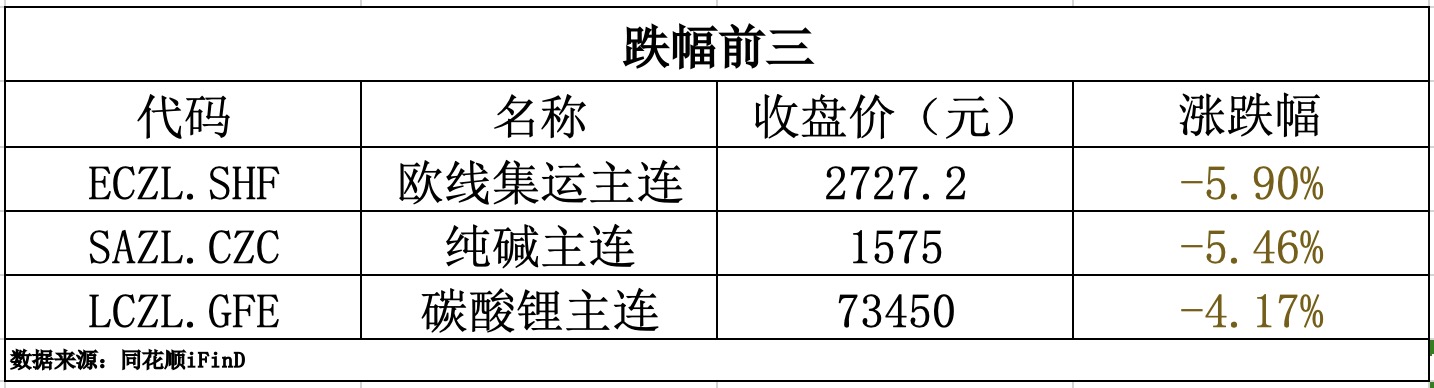 8月14日,国内商品期货收盘,多数下跌。欧线集运、纯碱跌超5%,碳酸锂、沪铅跌超4%,工业硅跌超3%;生猪涨超1%,烧碱、鸡蛋小幅上涨。