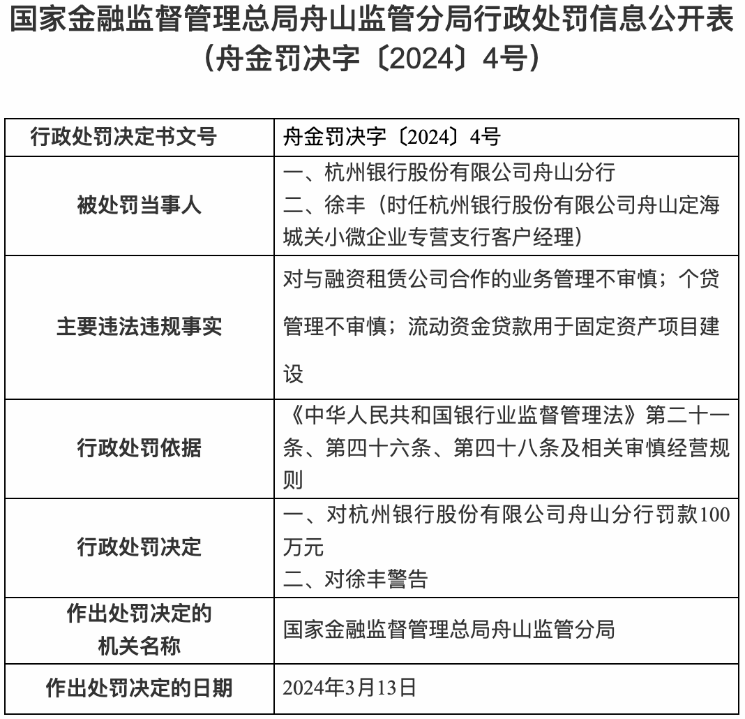 2024年3月,因对与融资租赁公司合作的业务管理不审慎、个贷管理不审慎、流动资金贷款用于固定资产项目建设,杭州银行舟山分行被罚款100万元,时任杭州银行股份有限公司舟山定海城关小微企业专营支行客户经理徐丰被警告。
