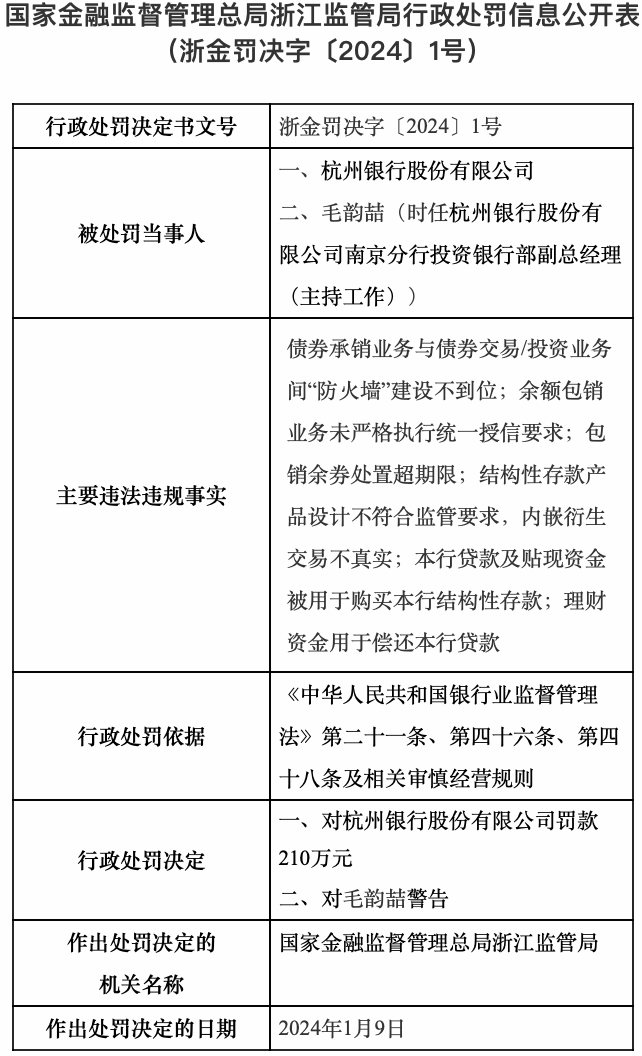 2024年1月,杭州银行收到国家金融监管总局浙江监管局1号罚单,因债券承销业务与债券交易、投资业务间“防火墙”建设不到位等问题,杭州银行被罚款210万元,时任南京分行投资银行部副总经理毛韵喆被警告。