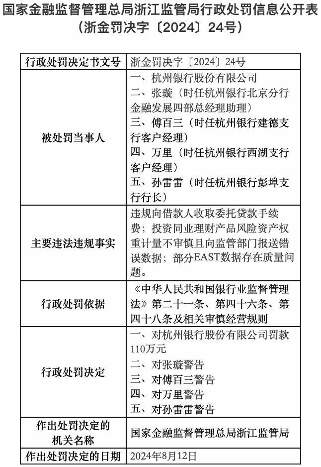 8月15日,国家金融监督管理总局浙江监管局网站显示,杭州银行被罚110万元,该行主要涉及违规向借款人收取委托贷款手续费、投资同业理财产品风险资产权重计量不审慎且向监管部门报送错误数据、部分EAST数据存在质量问题等违法违规行为。