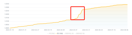 作为榜单中唯一一只半年收益超3%的产品,其近半收益是由5月中下旬一轮上涨贡献。该产品累计净值在5月中下旬有一轮明显上涨,5月14日至5月31日区间涨幅1.3%。截至上半年末,该产品超五成资金投向拆放同业及债券买入返售资产,前三大持仓均为质押式逆回购。运作说明书表示,该产品4月下旬调整以来,逢高加仓二永债及中长久期利率债,并适度加仓利率债基及中短债基。