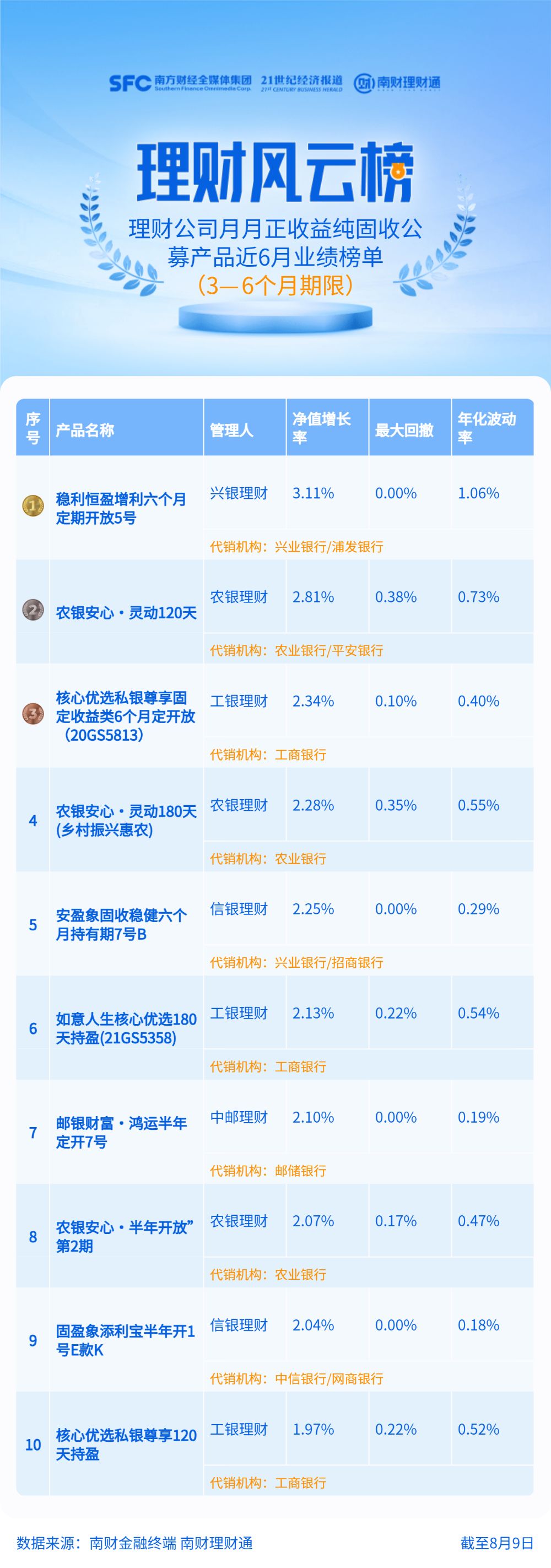 兴银理财“稳利恒盈增利六个月定期开放5号”以3.11%的近6月净值增长率位列第一;农银理财“农银安心·灵动120天”和工银理财“核心优选私银尊享固定收益类6个月定开放(20GS5813)”近6月净值增长率分别为2.81%和2.34%,位列第二和第三。上榜产品最大回撤不超0.4%,其中4只产品近6月无回撤。