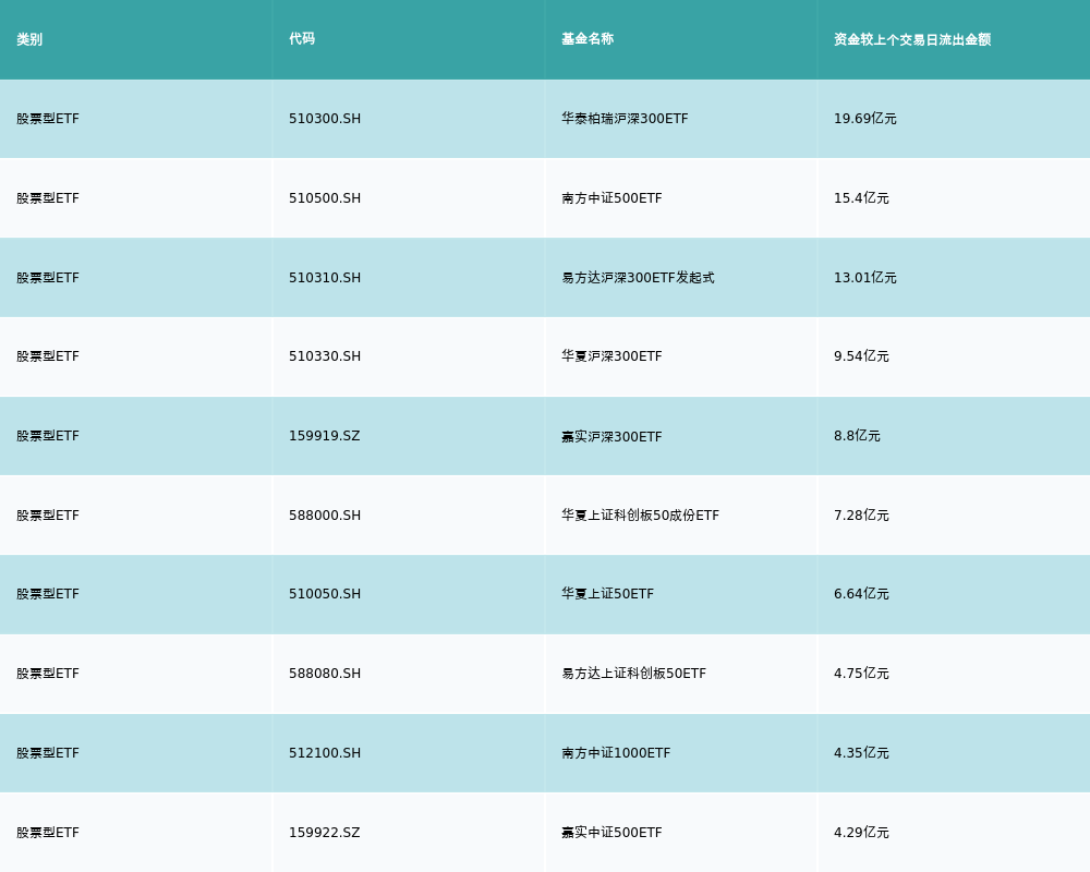 昨日股票型ETF资金流出最多的3支ETF及其流入金额分别为:华泰柏瑞沪深300ETF(流出19.69亿元)、南方中证500ETF(流出15.4亿元)、易方达沪深300ETF发起式(流出13.01亿元)。资金流出前10详情见下表: