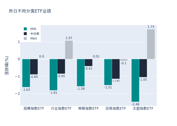 昨日股票型ETF收益率中位数为-0.96%。其中按照不同分类,规模指数中沪深300ETF基金收益率最高,为0.0%;行业指数中华夏中证绿色电力ETF收益率最高,为1.07%;策略指数中南方富时中国国企开放共赢ETF收益率最高,为0.01%;风格指数中招商中证银行AH价格优选ETF收益率最高,为-0.1%;主题指数中国泰中证动漫游戏ETF收益率最高,为1.73%。