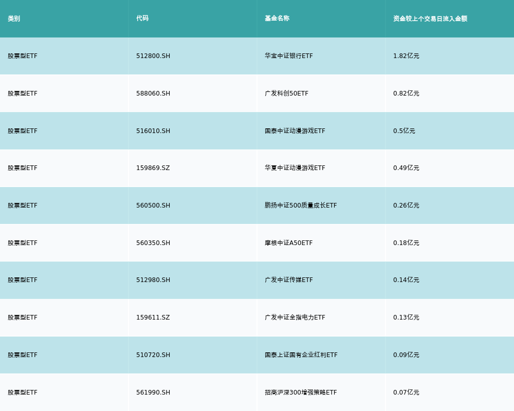昨日股票型ETF资金流入最多的3支ETF及其流入金额分别为:华宝中证银行ETF(流入1.82亿元)、广发科创50ETF(流入0.82亿元)、国泰中证动漫游戏ETF(流入0.5亿元)。资金流入前10详情见下表: