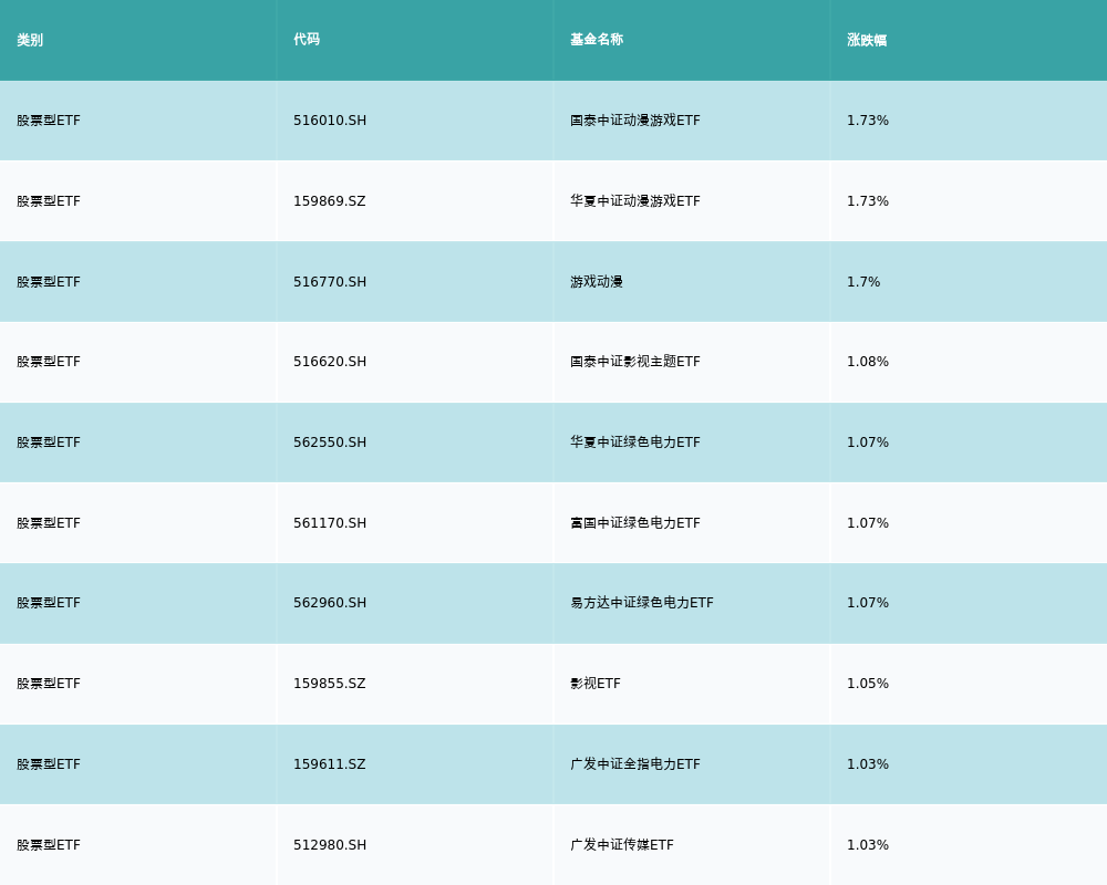昨日股票型ETF涨幅最高的3支ETF及其收益率分别为:国泰中证动漫游戏ETF(1.73%)、华夏中证动漫游戏ETF(1.73%)、游戏动漫(1.7%)。涨幅前10详情见下表: