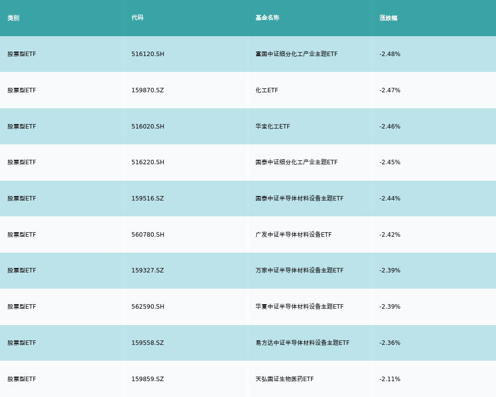 昨日股票型ETF跌幅最大的3支ETF及其收益率分别为:富国中证细分化工产业主题ETF(-2.48%)、化工ETF(-2.47%)、华宝化工ETF(-2.46%)。跌幅前10详情见下表: