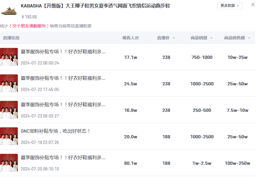 以7月20日上午8时的一场直播为例,KABASHA【升级版】大王椰子鞋售价193.69元,商品销售额达到100万元至250万元。