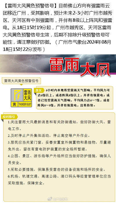 受其影响,预计未来2-3小时广州市越秀区、天河区有中到强雷雨,并伴有8级以上阵风和强雷电。从18日15时19分起,广州市越秀区、天河区雷雨大风黄色预警信号生效,后期不排除升级预警信号可能性,请注意做好防御。