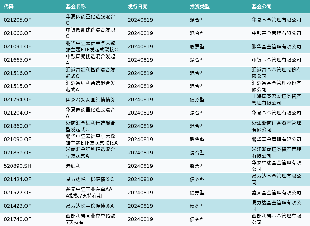 8月19日有16只新基金发行,分别为:华夏医药量化选股混合C、中银周期优选混合发起C、鹏华中证云计算与大数据主题ETF发起式联接C、中银周期优选混合发起A、汇添富红利智选混合发起式C、汇添富红利智选混合发起式A、国泰君安安宜纯债债券、华夏医药量化选股混合A、浙商汇金红利精选混合型发起式C、鹏华中证云计算与大数据主题ETF发起式联接A、浙商汇金红利精选混合型发起式A、港红利、易方达悦丰稳健债券C、鑫元中证同业存单AAA指数7天持有期、易方达悦丰稳健债券A、西部利得同业存单指数7天持有,详情见下表: