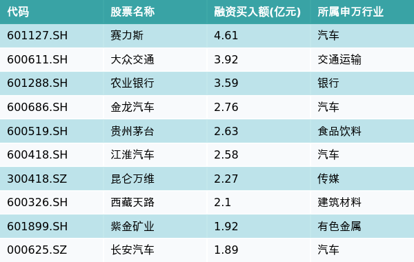 8月19日,两市共有3356只个股有融资资金买入,其中赛力斯、大众交通、农业银行排名前三,买入金额分别4.61亿元、3.92亿元、3.59亿元。融资买入额前10个股详情见下表: