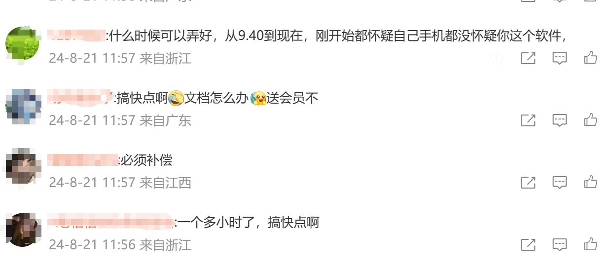 网友纷纷表示,WPS出现了故障,“刚开始怀疑自己手机都没有怀疑软件”“文档怎么办”“必须补偿”。值得注意的是,8月19日#网易云音乐崩了#同样登上热搜,随后官方致歉并给予用户7天会员权益作为补偿。